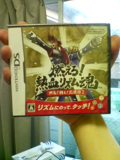 やっと手に入れましたああああああああああ→コレをっ! 数年前にブラボーミュージックという音ゲーにずっぽりとハマった私が、テレビCMを見た瞬間に「こ、これは買わなければならぬ!」と直感したニンテンドーDSの音ゲー「燃えろ!熱血リズム魂」。発売日から足繁く家電量販店を見て回るも、どこに行ってもソールドアウト。新宿、渋谷、池袋のほとんどの量販店に足を運びましたが、そりゃもう見事なまでに完売御礼。新宿通り沿いにある某ックカメラに至っては、パッケージすら店内に置かないという始末。「熱血なリズムを魂に刻むことはできないのか」と、半ば途方に暮れつつ、諦め半分でふらりと入ったCDレンタル店で…見つけたんです。つか、メチャメチャ店頭に並んでたんです。それを視認した私は即買い。加藤鷹の手マンよりも早くソフトを手に取り、ベンジョンソンのドーピング100mダッシュよりも早くレジに向かいましたよ。これで…これで数日間は部屋に引き篭もることができます。本当にありがとうございました!